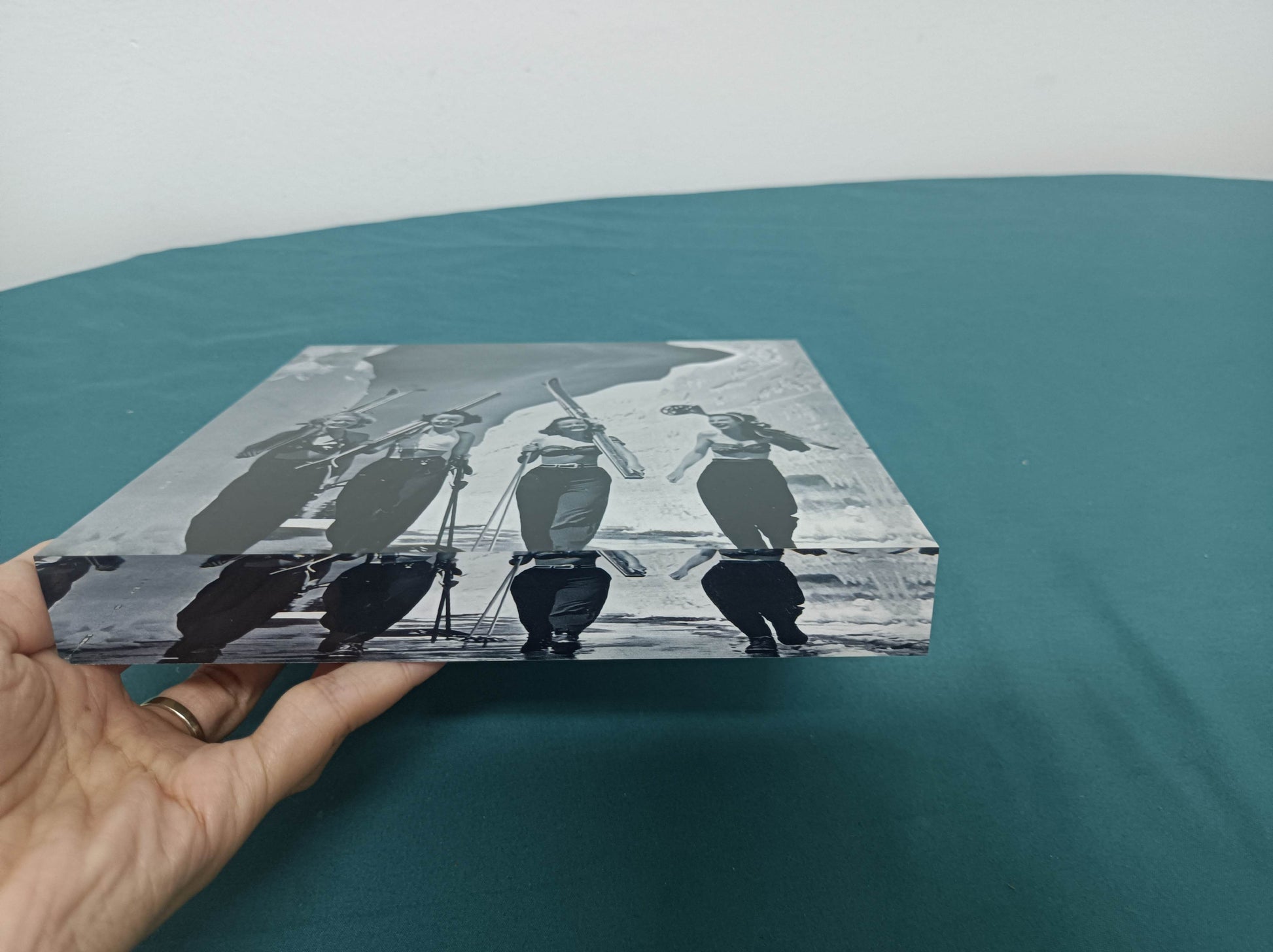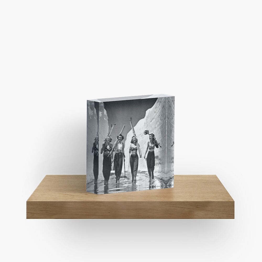 Introducing our one-of-a-kind Girls Gone Skiing acrylic display block! Measuring 7"x7"x1" thick! This display block allows light to shine through, creating a captivating "glow" effect and an incredible multidimensional display. The remarkable clarity adds a unique elegance to any room, making it a standout piece of décor.