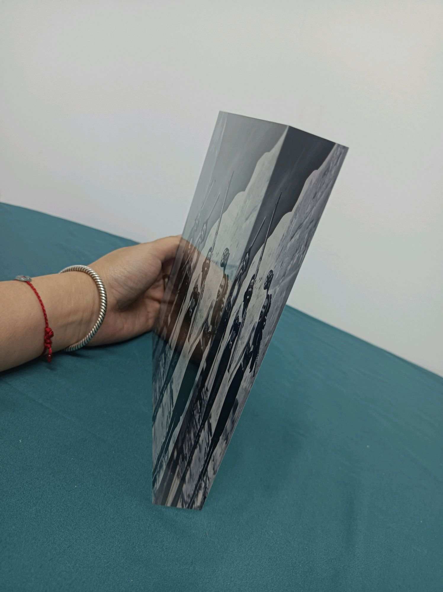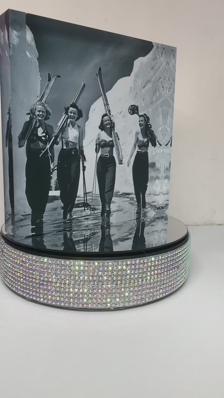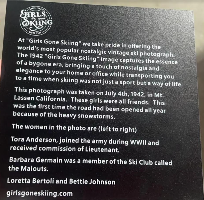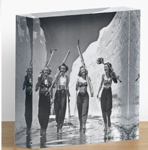 At the heart of this stunning display block is the iconic 1942 “Girls Gone Skiing” vintage ski photograph. This image, capturing the essence of a bygone era, brings a touch of elegance and nostalgia to your living space. The Girls Gone Skiing story is printed on the back of this unique piece which adds even more excitement to this piece.
