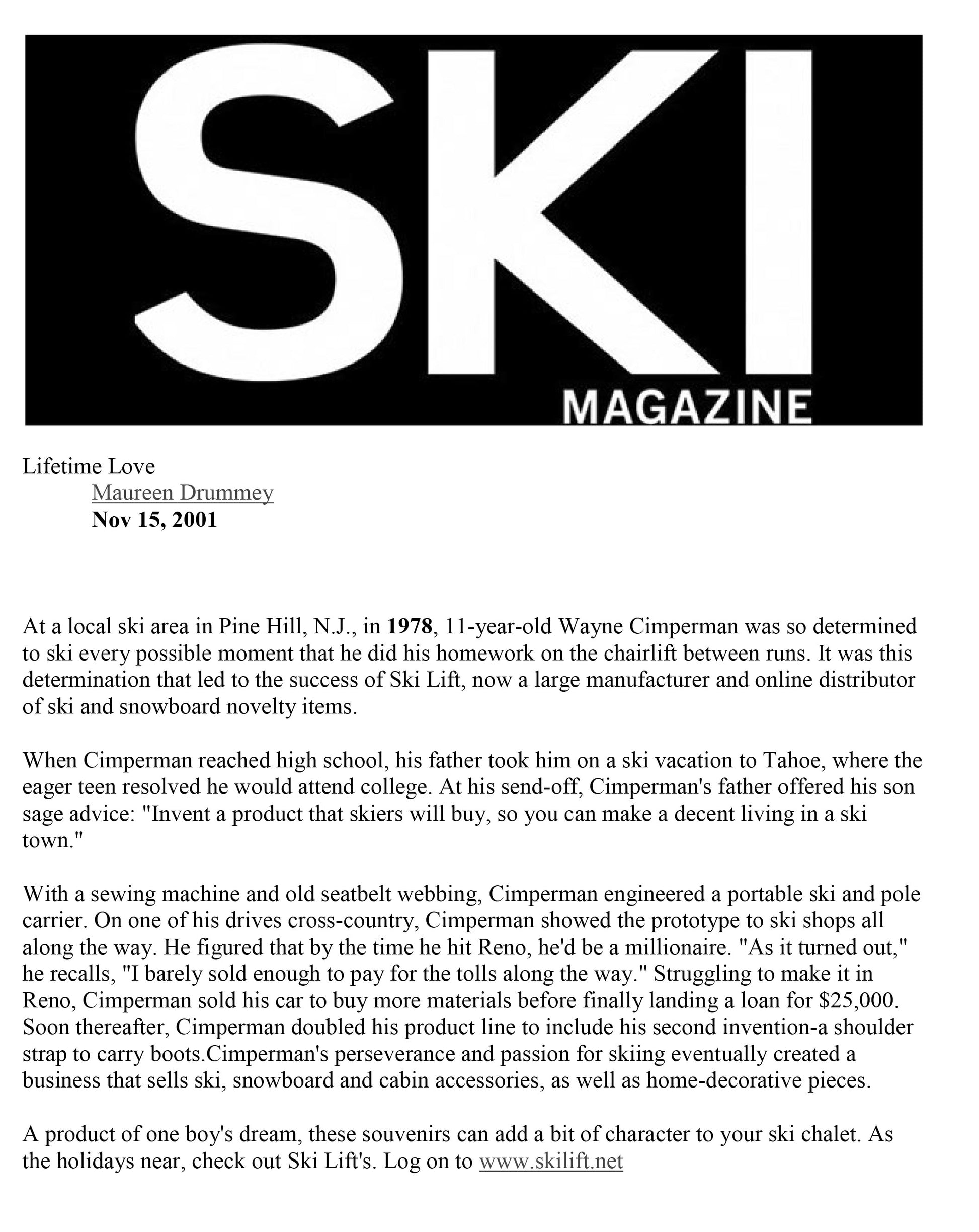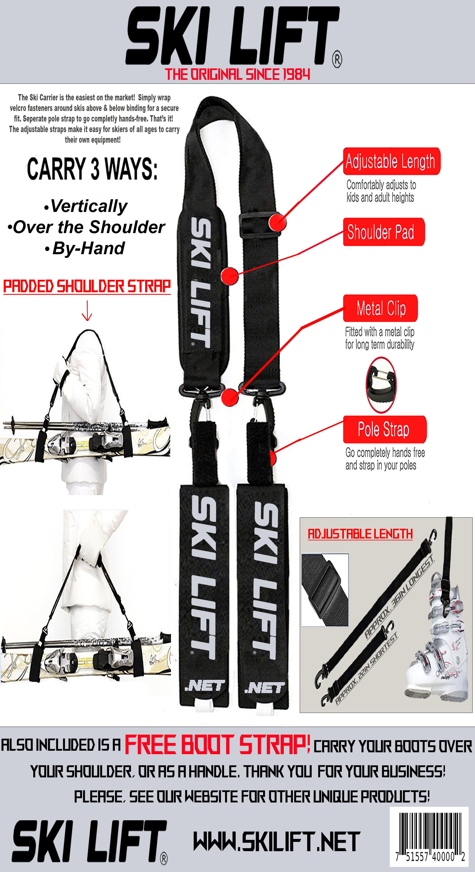 The SKI LIFT allows you to carry your skis in three different ways: vertically, over the shoulder, or as a handle horizontally. No need to purchase a boot strap separately; we have included one for free! See the attached photo for the complete Ski Lift story that was published in SKI Magazine.