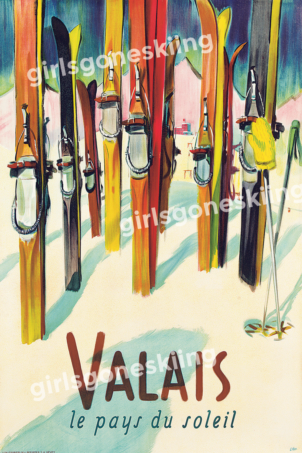 Valais is in Switzerland. This L-shaped valley which was cut by glaciers between two alpine mountain ranges. A winter paradise for skiing, somewhere between heaven and earth. If you like winter, you’ll love Valais! This is one of our most popular vintage ski posters of all time! A must to add to the wall of the worlds most popular ski images.