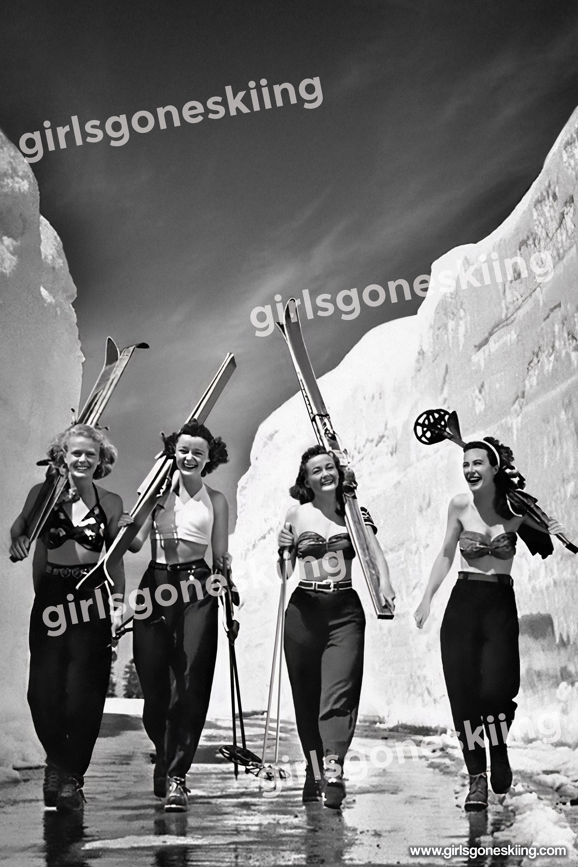 This is the world’s most sought-after vintage ski photo. This photograph was taken on July 4th, 1942, in Mt. Lassen California. These girls were all friends. This was the first time the road had been opened all year because of the heavy snowstorms. This is a personal photograph from the ladies in the photo who granted us the rights to use on our products.