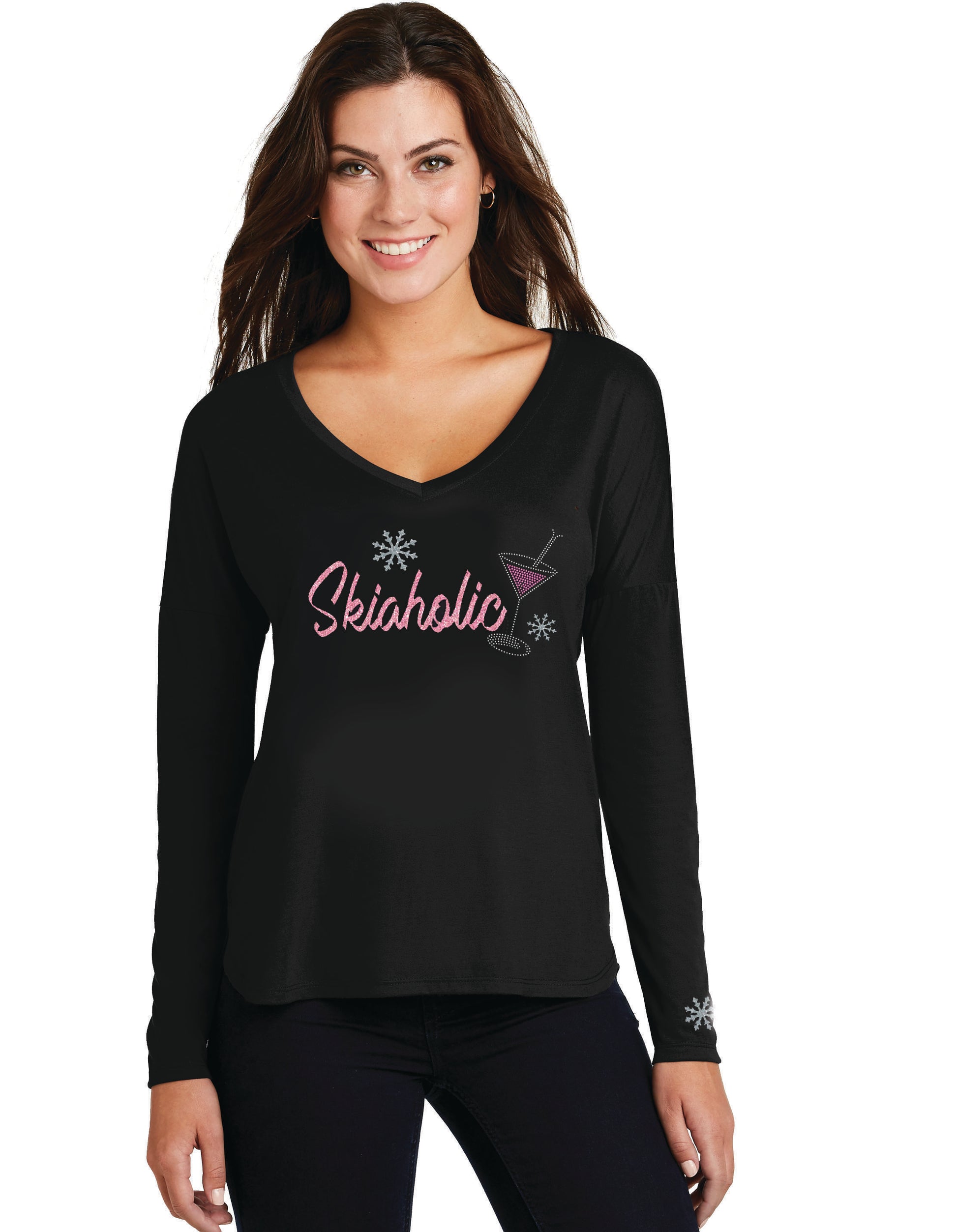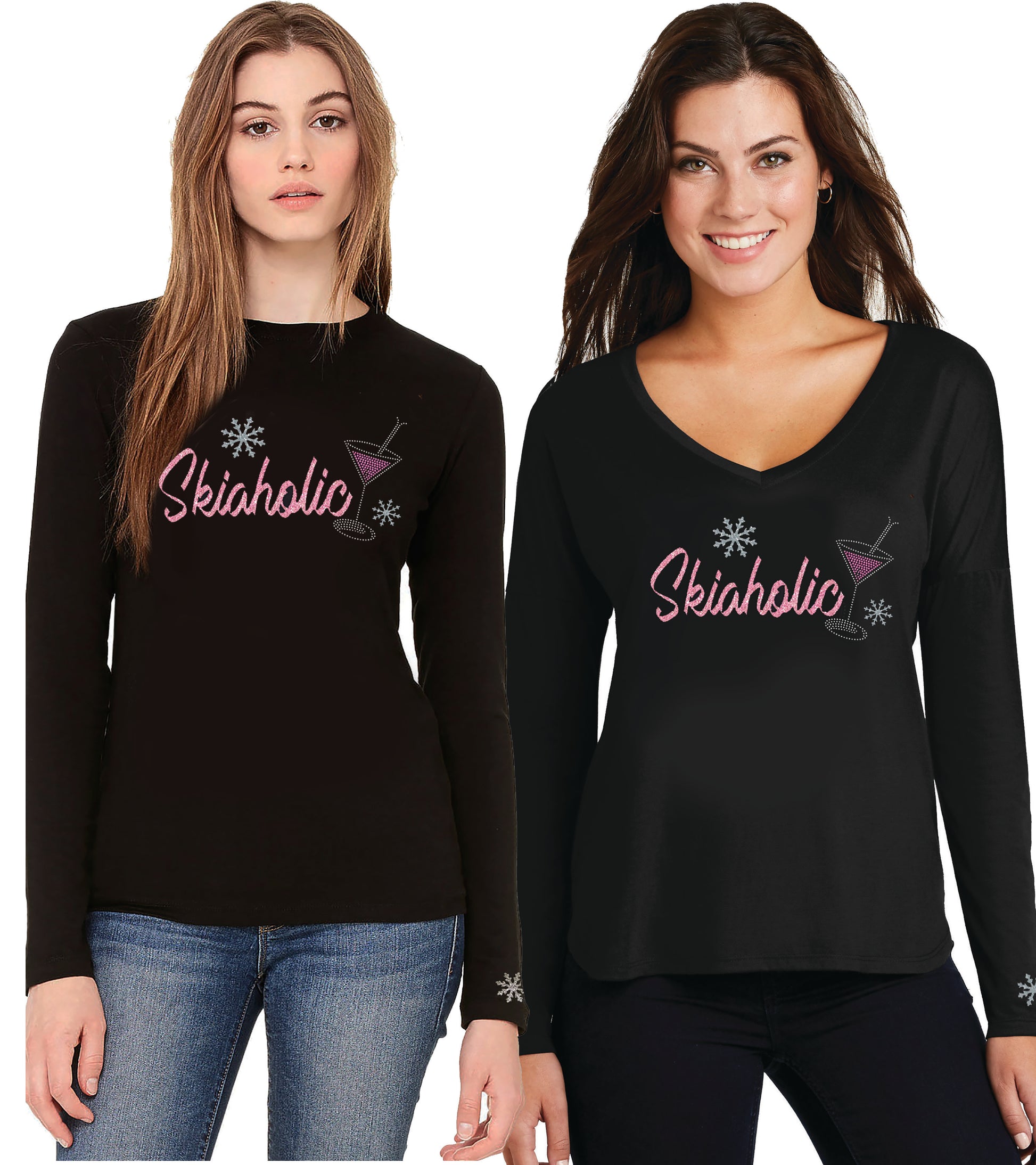 BRAND NEW FOR 2024! This Rhinestone and Glitter design incorporates fun snowflakes and even a more fun martini with a pair of skis as the mixer! A must for any apres ski specialist! You will certainly get lots of laughs styling this shirt on and off the slopes.