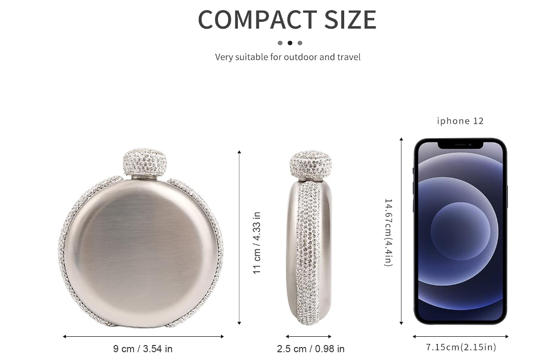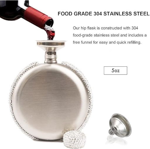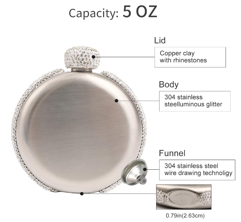 5 ounce Liquor Stainless Steel Ski Flask! This is a must have for any Ski-A-Holic! Decorated with rhinestones on the side and adorned with a rhinestone cap! This item is beautifully packaged in a silk gift box with funnel included for easy filling. A perfect high quality gift for anyone. Slips easily into one of many ski pockets.